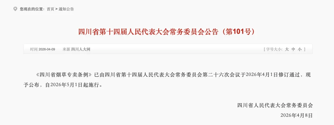 近日,《四川省烟草专卖条例》修订完成,禁止或限制公共场所吸烟,自2026年5月1日起施行!