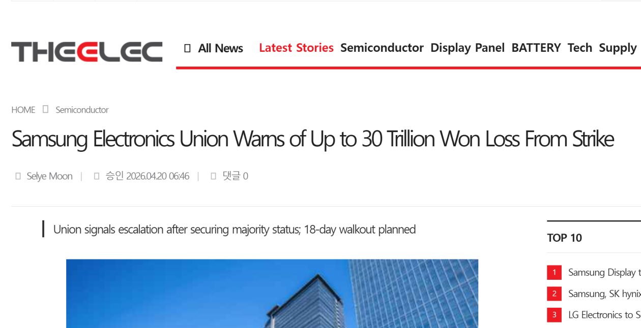 4月20日消息,据thelec报道,韩国三星集团跨企业工会近日表示,若与资方谈判破裂,计划于 5 月下旬至 6 月初举行罢工,此举可能导致最高 30 万亿韩元的生产中断损失,引发业界对全球半导体供应链稳定的担忧。