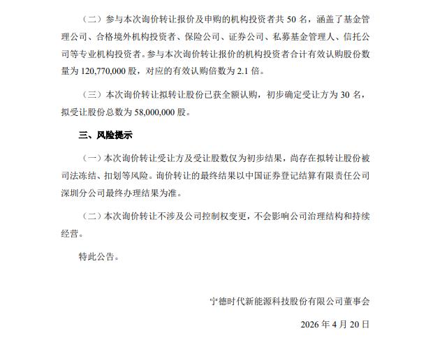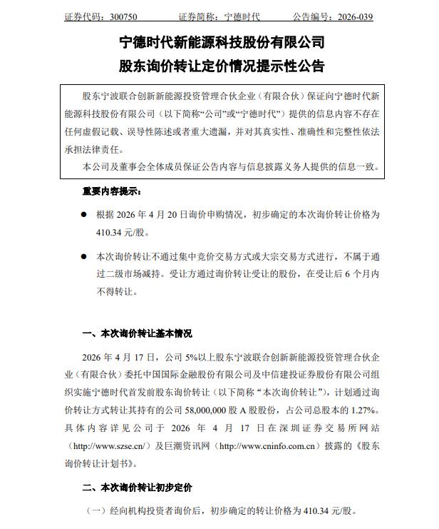 宁德时代(300750.SZ)公告称,公司5%以上股东宁波联合创新新能源投资管理合伙企业(有限合伙)计划通过询价转让方式转让其持有的5800万股公司股份,占总股本的1.27%。经向机构投资者询价,初步确定本次询价转让价格为410.34元/股。参与报价及申购的机构投资者共50名,有效认购倍数为2.1倍,拟转让股份已获全额认购,初步确定受让方为30名。本次询价转让不通过集中竞价或大宗交易方式进行,受让方在受让后6个月内不得转让。此次转让不涉及公司控制权变更,不会影响公司治理结构和持续经营。最终结果以中国结算深圳分公司办理结果为准。