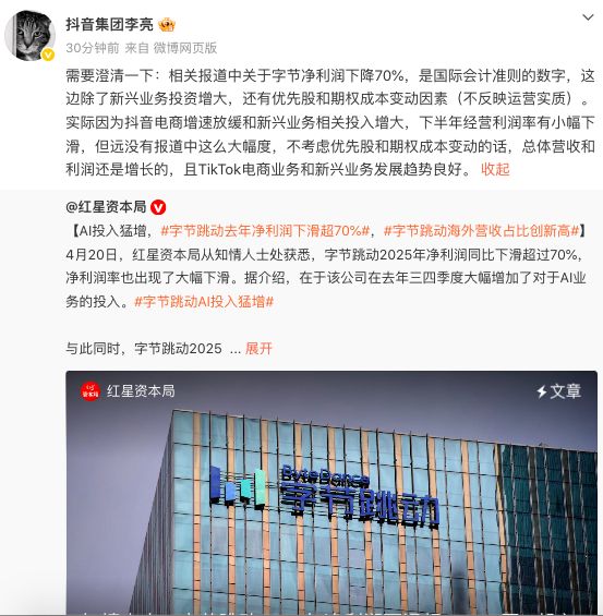 红星资本局4月20日消息,对于“字节跳动去年净利润下滑超70%”的消息,今日下午,抖音集团副总裁李亮在微博发文回应。