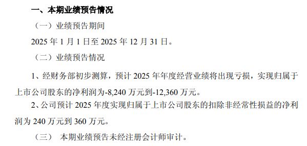 业绩预报显示,预计金鸿顺2025年净利润为-8240万元至-12360万元,扣非净利润为240万元至360万元。