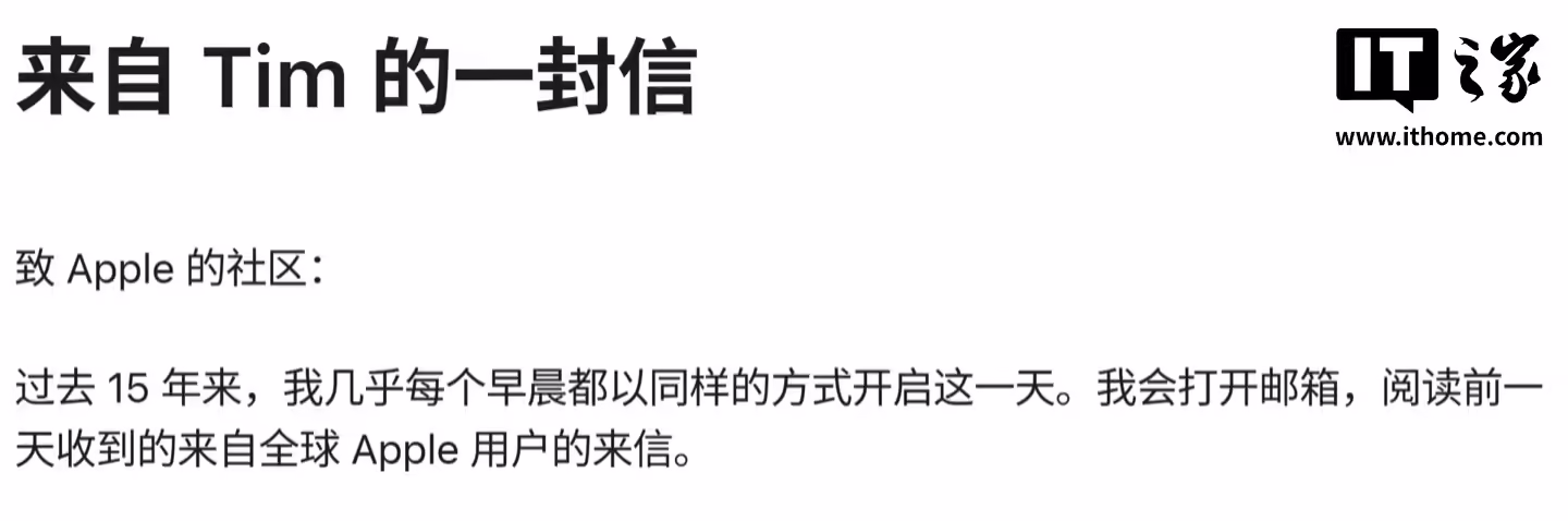 在这份感谢信中,库克深情回顾了过去 15 年的 CEO 生涯。他习惯每天早晨阅读全球用户发来的邮件,这些信件记录了用户被 Apple Watch 挽救生命的时刻,也包含了用户对产品改进的直言建议。库克表示,这些互动让他感受到了共同人性的跳动,也让他对领导这家公司充满了深深的感激与荣幸。