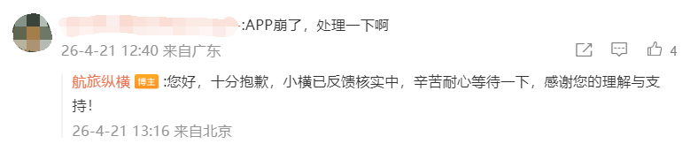 对此,@航旅纵横 官博在评论区回应称,“十分抱歉,小横已反馈核实中,辛苦耐心等待一下,感谢您的理解与支持!”