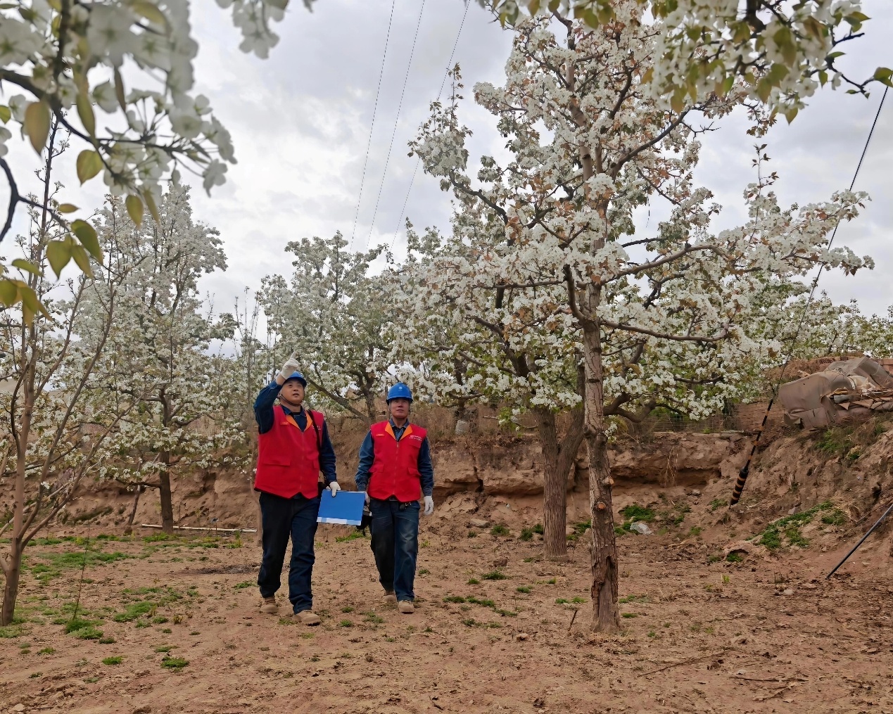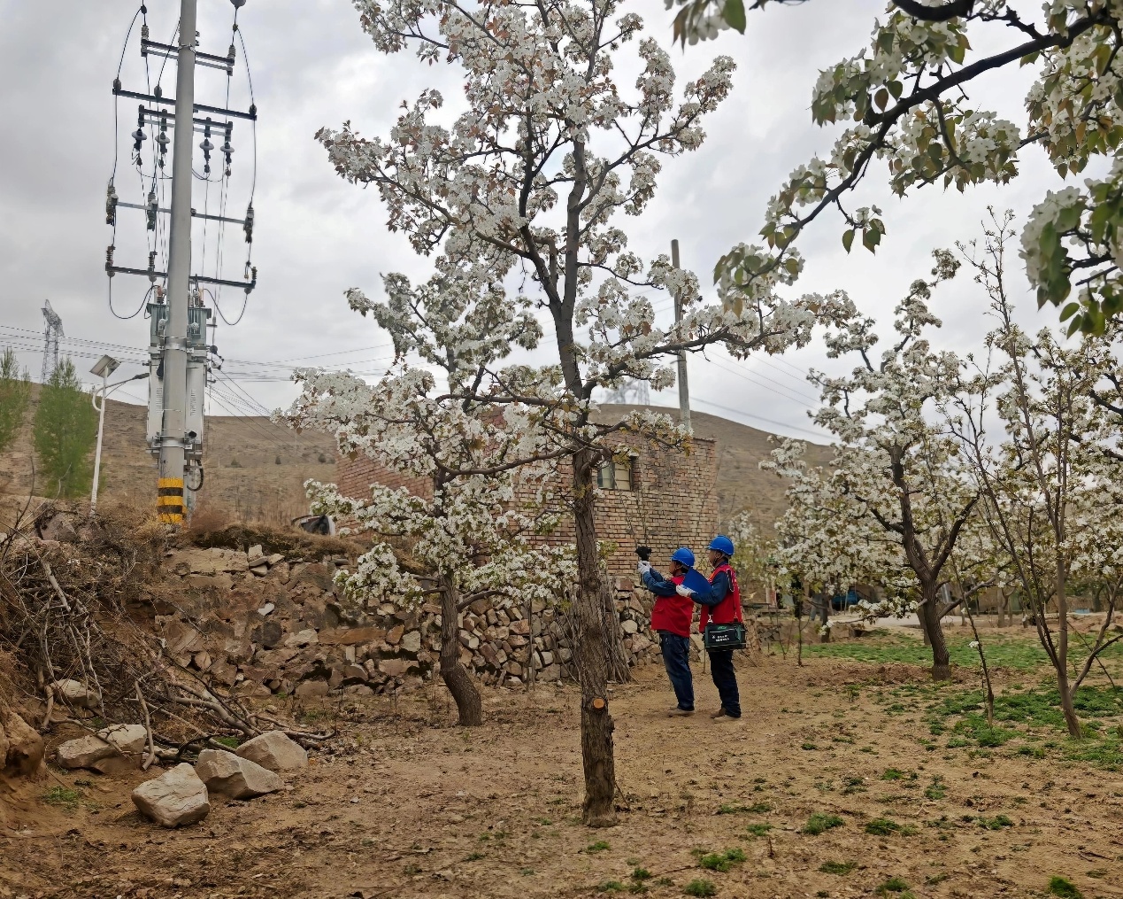 4月15日,正值梨花最佳观赏期,国网白银供电公司永新供电所工作人员王军基和同事一早便来到梨园腹地,手持红外测温仪和记录本,对周边供电线路、配电变压器开展专项特巡,全力保障梨花盛开期间电力安全稳定供应。