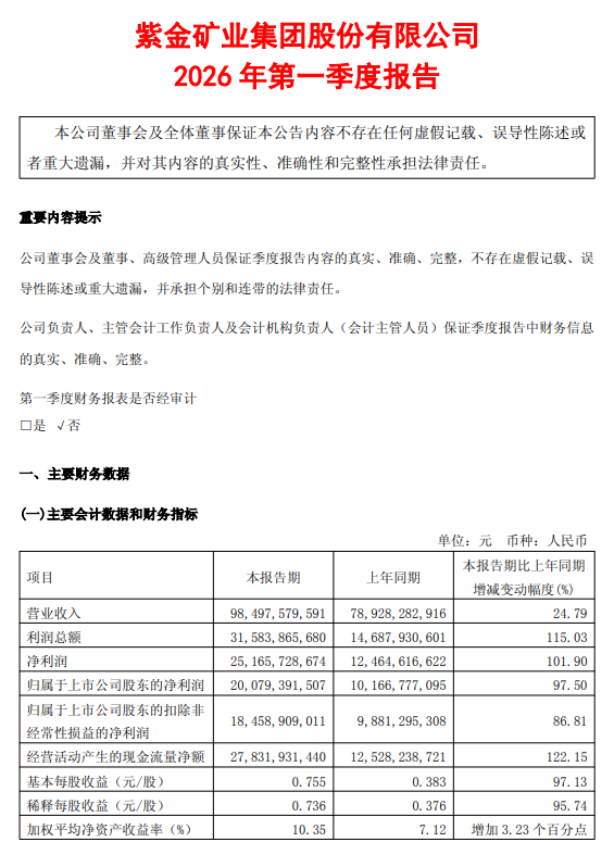 紫金矿业(601899.SH)公告称,2026年第一季度实现营业收入984.98亿元,同比增长24.79%;归属于上市公司股东的净利润为200.79亿元,同比增长97.50%。业绩变动主要系公司持续优化生产组织与运营管理,坚持尽产尽销,矿产金、碳酸锂产量同比增长,矿产铜产量受卡莫阿-卡库拉权益铜产量下滑影响同比有所下降;公司主营金属品种价格同比上涨,价格红利充分释放,推动经营业绩显著提升。同时,公司预计2026年当量碳酸锂产量12万吨,并规划至2028年提升至27-32万吨,届时将成为全球最大的锂矿生产商之一。