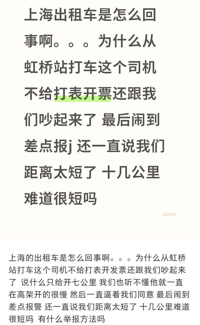 出租车是怎么回事啊。为什么从虹桥站打车,这个司机不给打表开发票,还跟我们吵起来了……说什么只给开七公里,我们也听不懂,他就一直在高架开得很慢。