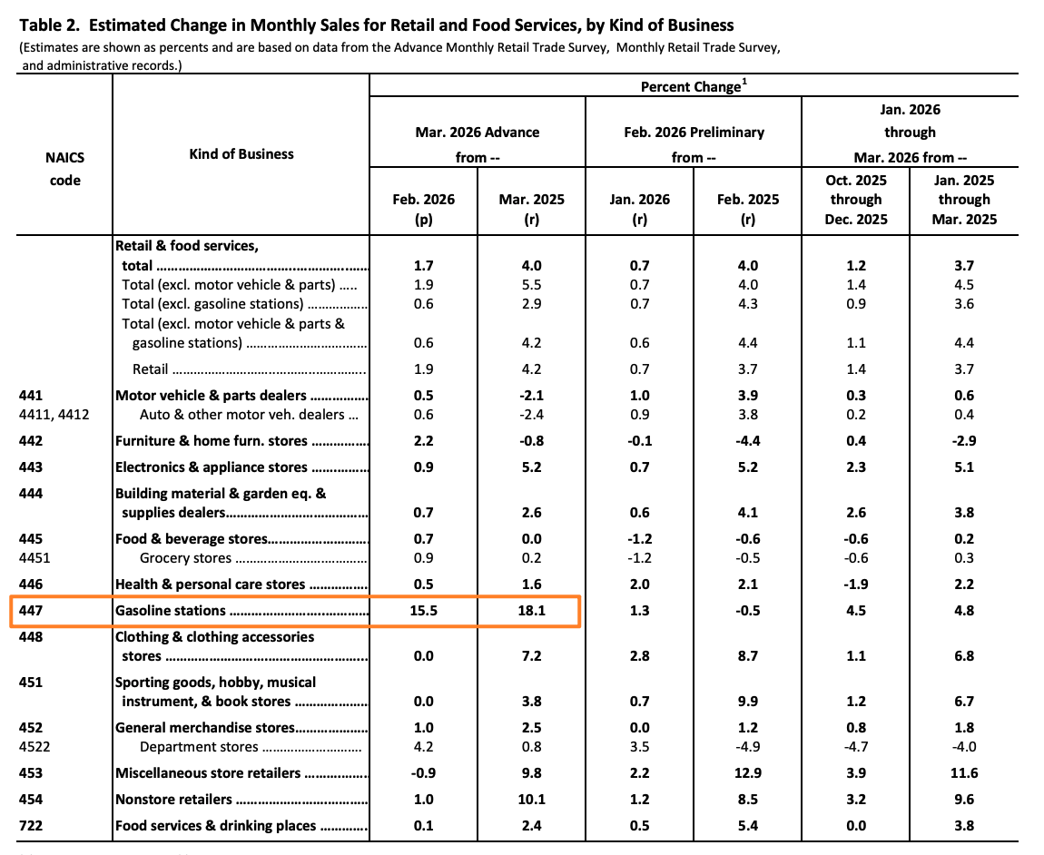这份数据主要由汽油价格上涨驱动。受伊朗战争影响,美国燃料价格快速攀升至2022年以来的最高水平。美国消费者3月在加油站的支出因此暴增15.5%。作为比较,美国汽油价格3月上涨了近3成。