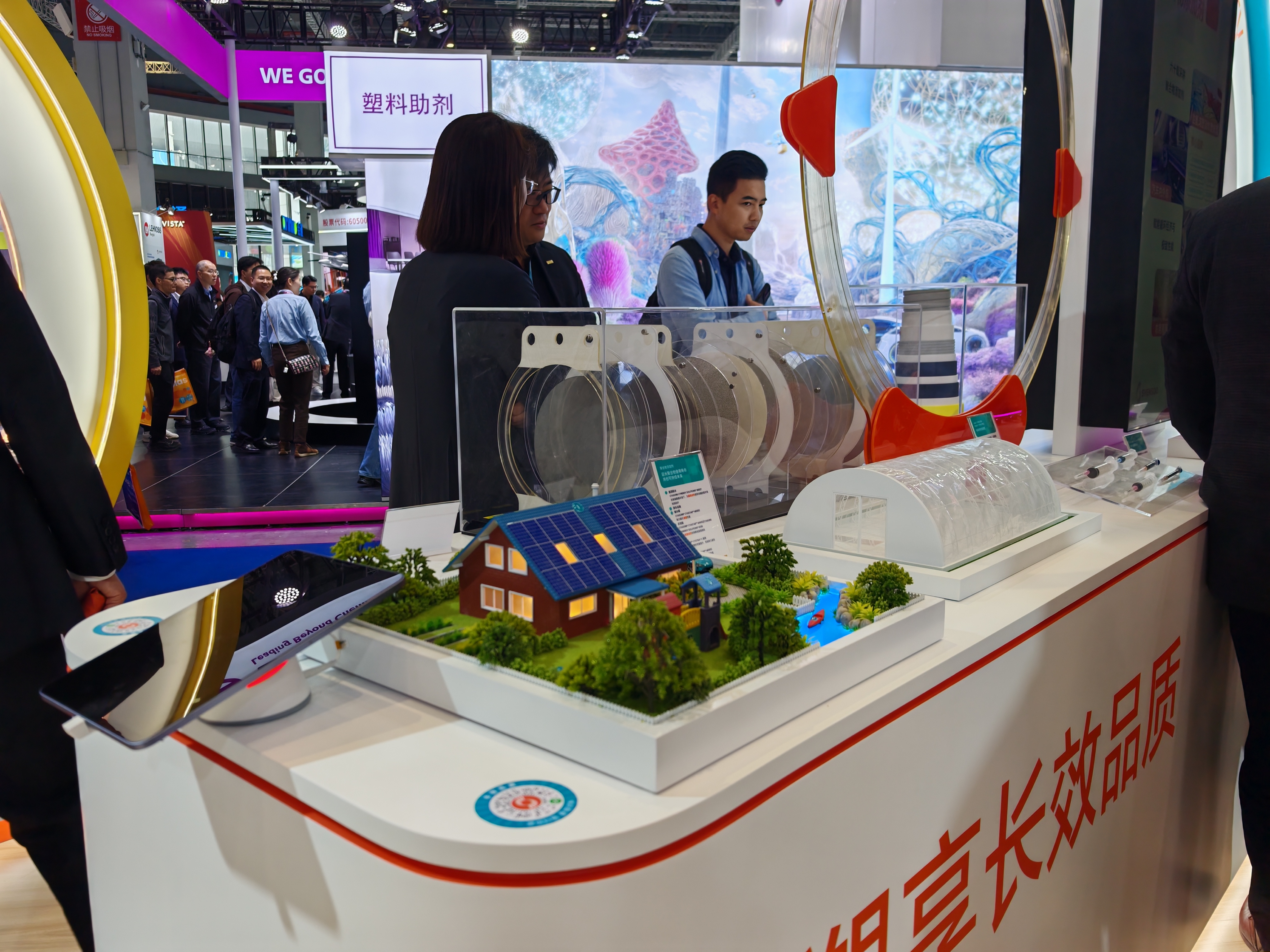 科思创今年在展会上呈现了其在飞行汽车、人形机器人、数据中心及医疗可穿戴等前沿领域的创新材料解决方案。现场一架电动垂直起降(eVTOL)飞行器颇为显眼。