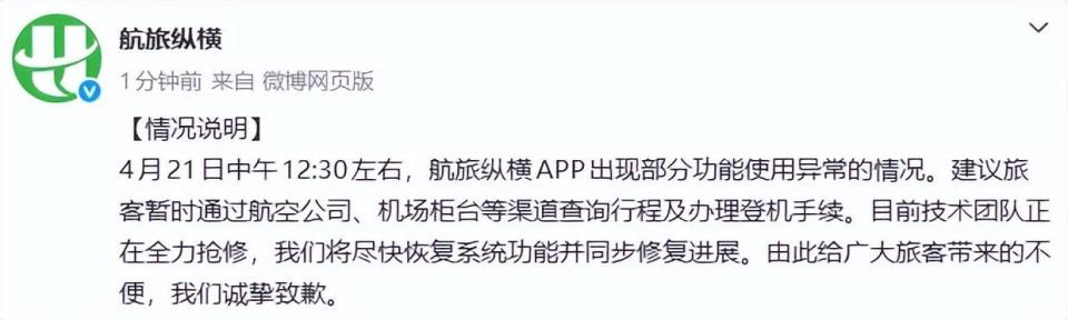 4月21日中午12:30左右,航旅纵横APP出现部分功能使用异常的情况。建议旅客暂时通过航空公司、机场柜台等渠道查询行程及办理登机手续。目前技术团队正在全力抢修,我们将尽快恢复系统功能并同步修复进展。由此给广大旅客带来的不便,我们诚挚致歉。