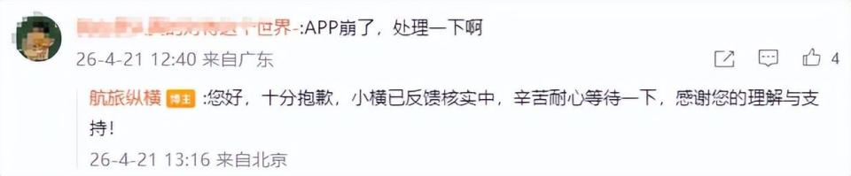 对此,航旅纵横官博在评论区回应称,“十分抱歉,小横已反馈核实中,辛苦耐心等待一下,感谢您的理解与支持!”