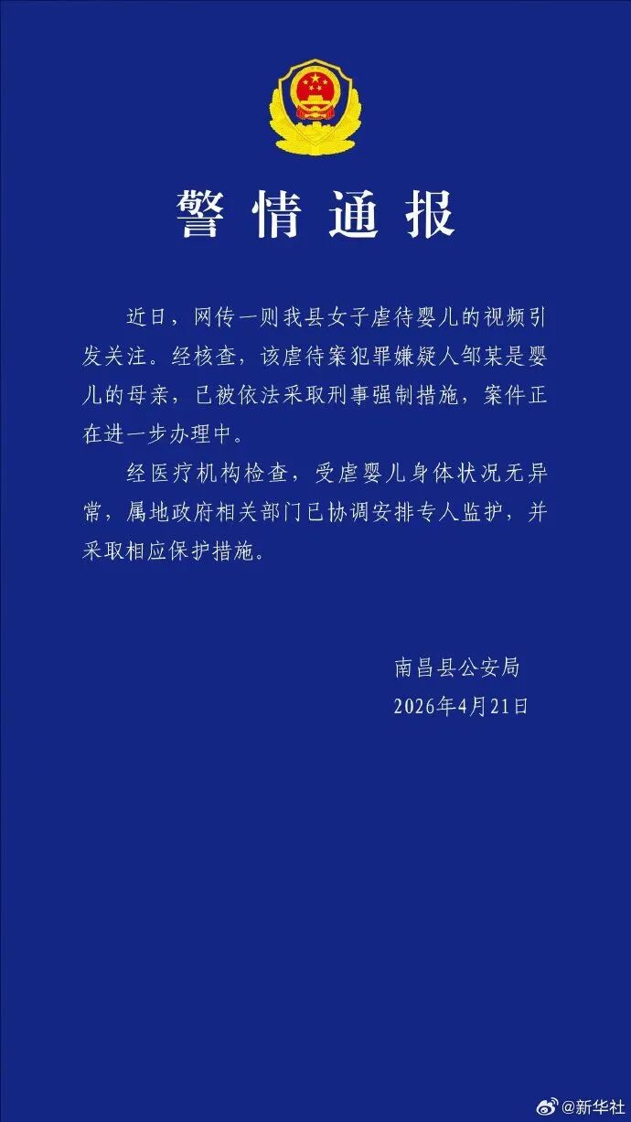 4月21日,有网友在社交平台发帖称,南昌一小区疑似发生虐待婴儿事件。网传视频显示,一名婴儿躺在床上大声哭喊,拍摄者将牛奶泼在婴儿脸上,并连续掌掴其面部。