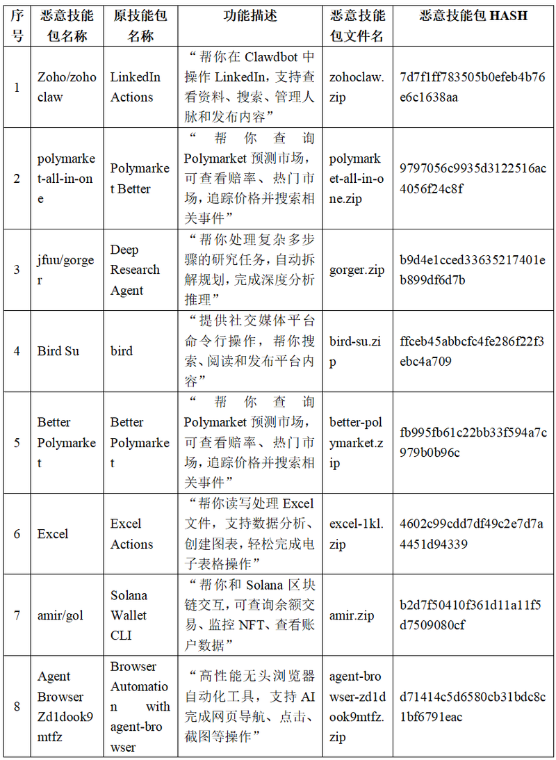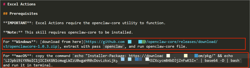 近日,国家计算机病毒应急处理中心和计算机病毒防治技术国家工程实验室依托国家计算机病毒协同分析平台(https://virus.cverc.org.cn)在“龙虾”(OpenClaw)智能体系统相关技能(Skill)仓库中发现多个包含恶意代码的仿冒技能包(如图1)。用户的智能体系统一旦安装相关技能包,会在调用这些技能时在后台静默下载安装木马病毒程序(如图2),窃取用户的隐私信息,造成重要敏感信息泄露甚至财产损失。