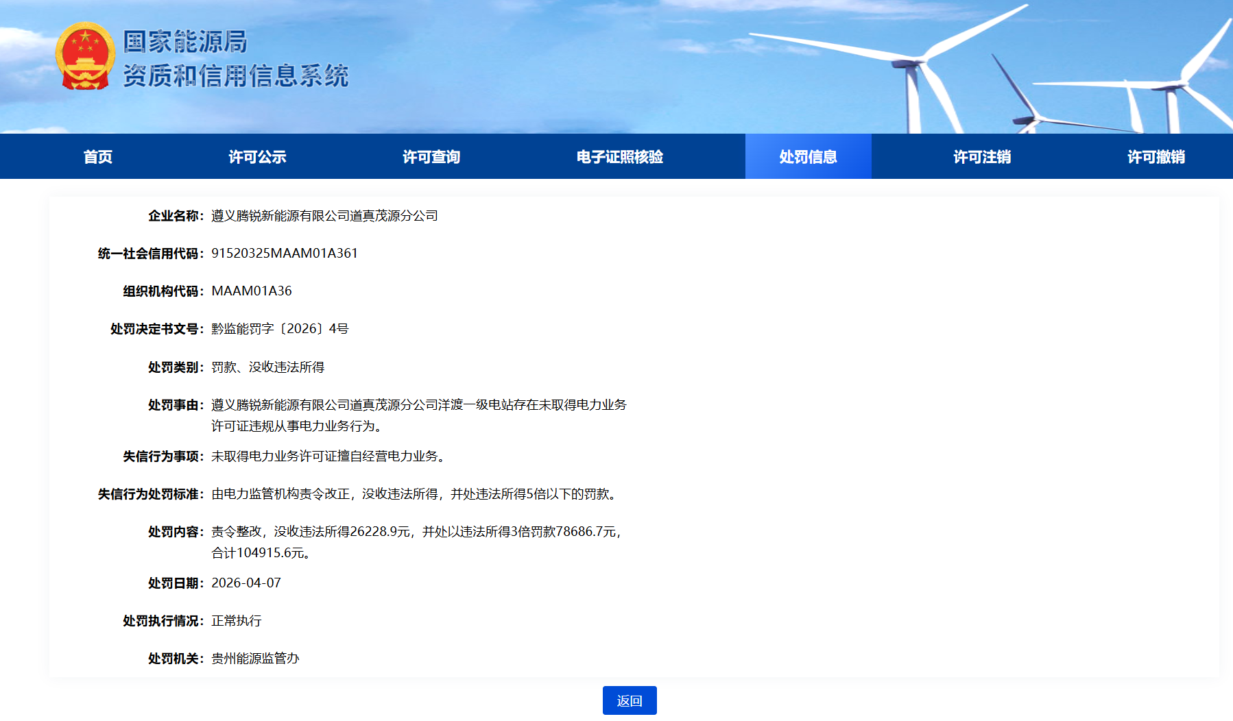 近日,国家能源局资质和信用信息系统信息显示,遵义腾锐新能源有限公司道真茂源分公司因其洋渡一级电站存在未取得电力业务许可证违规从事电力业务行为。贵州能源监管办给予其责令整改,没收违法所得26228.9元,并处以违法所得3倍罚款78686.7元,合计104915.6元。