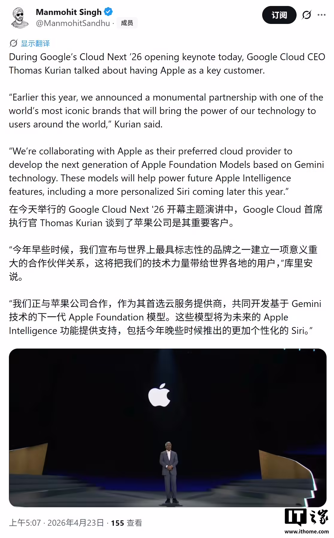 科技媒体 AppleInsider 昨日(4 月 22 日)发布博文,报道称在谷歌 Cloud Next 26 大会主题演讲中,谷歌云首席执行官托马斯 · 库里安(Thomas Kurian)公开确认,基于 Gemini 技术构建的苹果新一代 Siri 将于 2026 年发布。