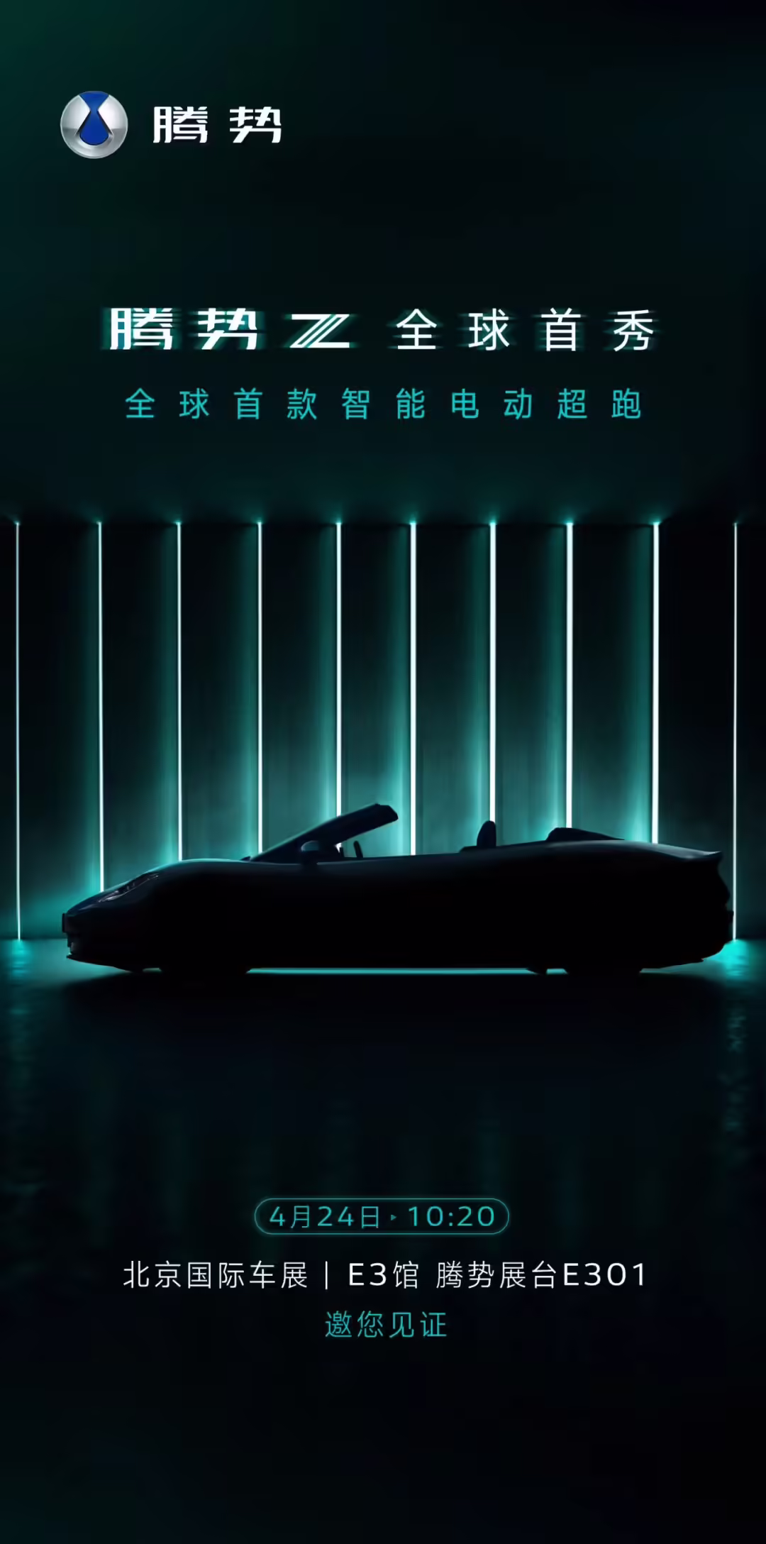 4 月 22 日晚间,腾势汽车通过官方公众号宣布:“全球首款智能电动超跑”腾势 Z 将于 4 月 24 日 10:20 在 2026 北京国际车展上迎来全球首秀。从官方发布的预告图来看,此次亮相的车型将是腾势 Z 的敞篷版。