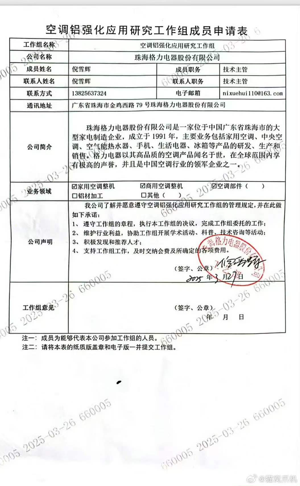 此外,其还贴出一张签字企业为格力的《空调铝强化应用研究工作组成员申请表》,并附言“又当又立”。