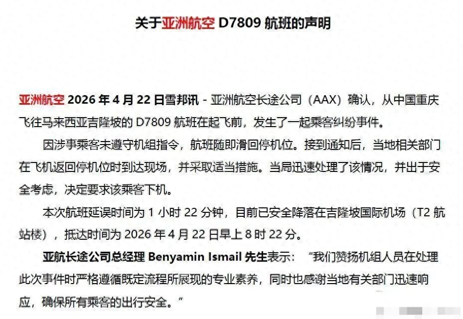 随后,亚洲航空发布声明:因涉事乘客未遵守机组指令,航班随即滑回停机位。接到通知后,当地相关部门在飞机返回停机位时到达现场,并采取适当措施。当局迅速处理了该情况,并出于安全考虑,决定要求该乘客下机。本次航班延误时间为1小时22分钟,目前已安全降落在吉隆坡国际机场(T2航站楼),抵达时间为2026年4月22日早上8时22分。
