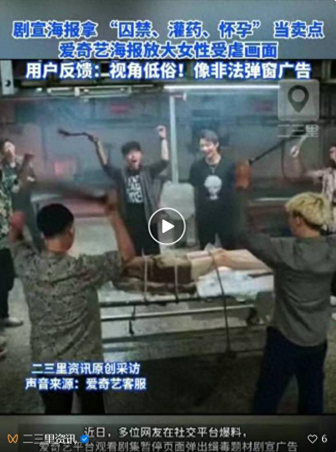 根据网友发布的大量截图与录屏显示,爱奇艺的争议弹窗广告集中出现在剧集暂停界面,广告画面聚焦女性受虐场景:女警角色被绑、穿着暴露,三位女性满眼惊恐护着怀孕的肚子。文案表述为“毒枭用酷刑折磨女卧底”“东南亚魔窟”“少女被强灌不明药水,醒来竟身陷东南亚吃人园区”。
