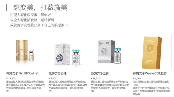 目前在锦波生物的官网上,薇旖美的ColNet、极纯、WeaveCol等多款产品定价为6800元到18730元不等,区别在于产品成分、纯度、功效等不同。