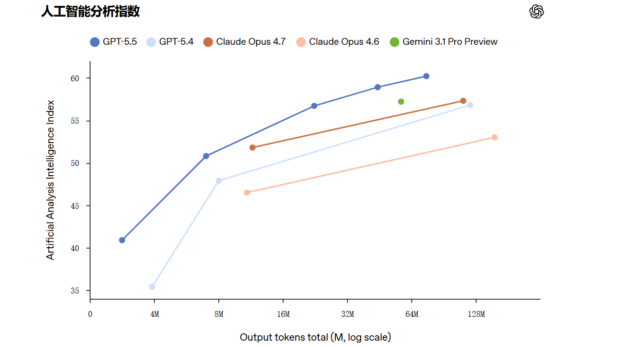 OpenAI公布的数据显示,在Artificial Analysis Intelligence Index(第三方,10项eval加权平均)上,GPT-5.5在同等输出token量下智能得分最高,token总消耗明显低于其他模型。