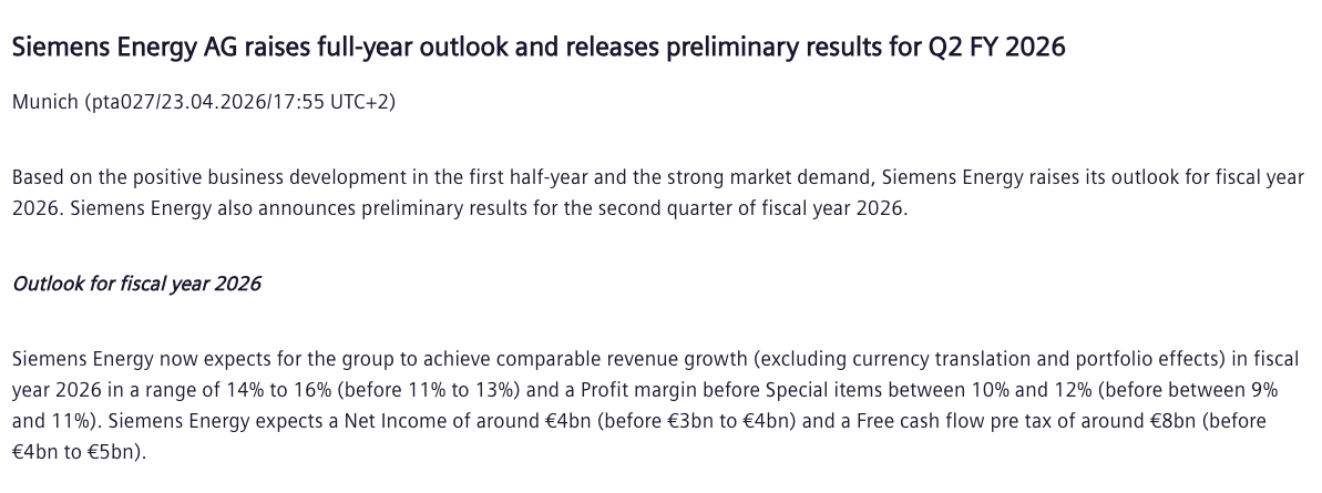 北京时间周四深夜,欧洲电力设备巨头以及“燃气轮机三巨头”之一的西门子能源在欧洲股市收盘后发布公告,宣布“基于上半年业务的积极发展和强劲的市场需求”,上调2026财年的业绩指引。