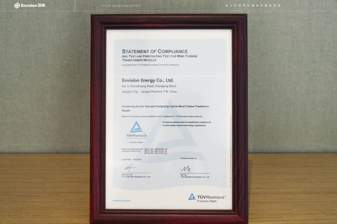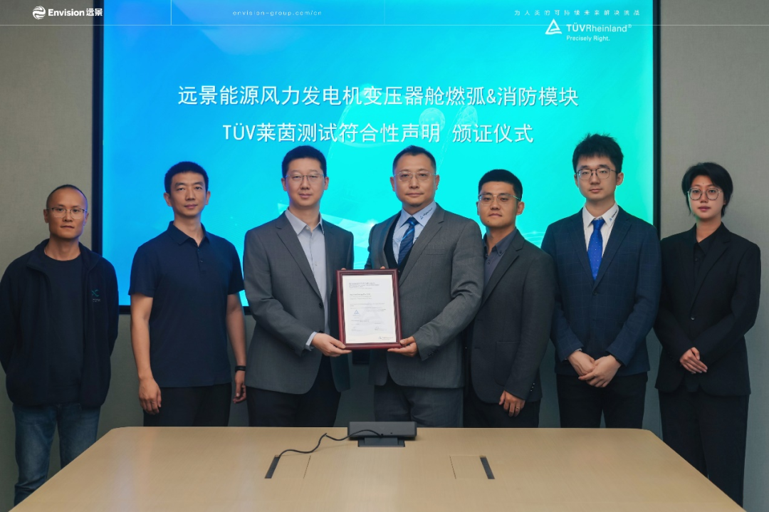 这一突破性成果,不仅填补了国内大型风电装备机舱侧舱综合性能检测的技术空白,更标志着远景ETOP机型在防火安全设计上走在了行业前列——从“被动灭火”走向“主动预防”,从“单点防护”走向“系统隔离”。在4月16日举行的远景能源风力发电机变压器舱燃弧&消防模块TÜV莱茵测试符合性声明颁证仪式上,德国莱茵TÜV集团大中华区工业服务与能源环境部总经理朱国表示,随着欧盟风电市场准入标准的持续升级,未来针对风电机组的认证要求将更为严格。远景能源此次率先开展风电机舱变压器舱燃弧测试与防火测试,以科学严谨的测试方法系统评估机舱的安全性与可靠性,为大兆瓦机组的安全稳定运行提供了坚实保障。此次测试充分体现了远景能源在产品质量与设计标准上的更高追求,这与全球市场对安全与品质日益提升的期待高度契合。
