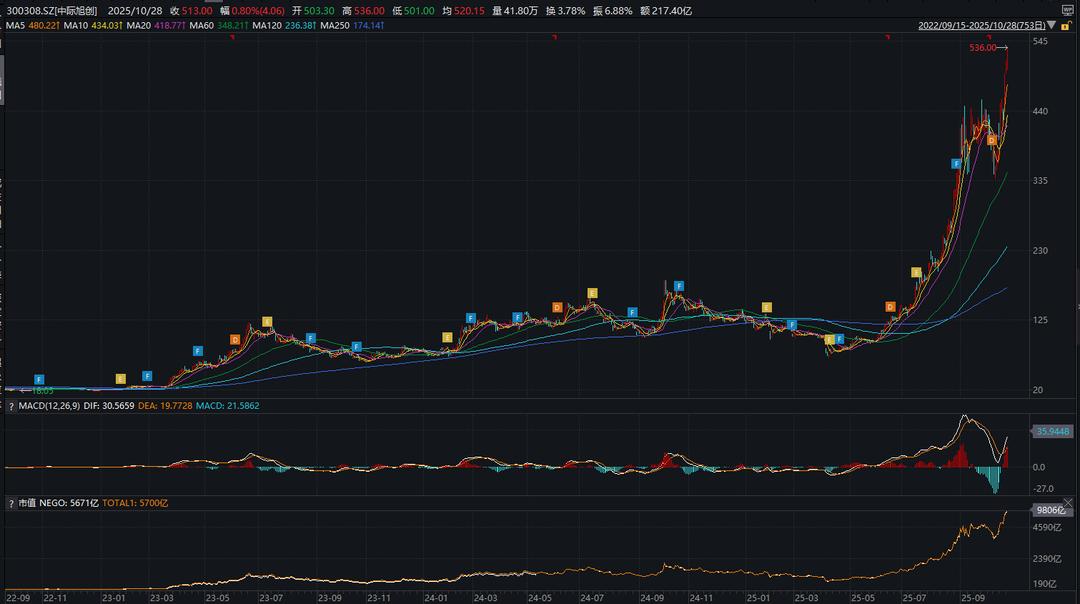 中际旭创的万亿市值,是技术沉淀与行业红利共振的结果。2023年2月,公司股价仅21.23元,市值不足200亿元;2024年9月,股价涨至184.9元,市值破千亿;2025年3月开启第二轮上涨,一年涨幅超1200%。