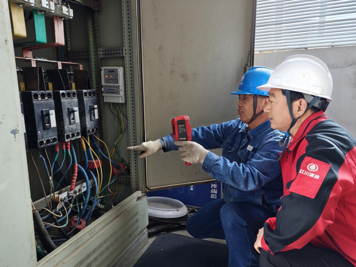 工作人员刚一进门,就跟着酒厂师傅钻到了设备堆里。配电柜前,他们先对配电柜的接线端子进行红外测温,确认温度处于正常区间;随后逐一测试发酵罐温控设备的供电接口,排除接触不良隐患。“您看这发酵罐的温控器,电压稳了,酒醅的‘脾气’才顺。”工作人员拍着运转的设备笑着说。在仓储区,工作人员重点检查了防爆灯具、通风设备的线路绝缘情况,提醒现场人员“仓储区要避免私接临时线路,定期检查电器散热情况”。