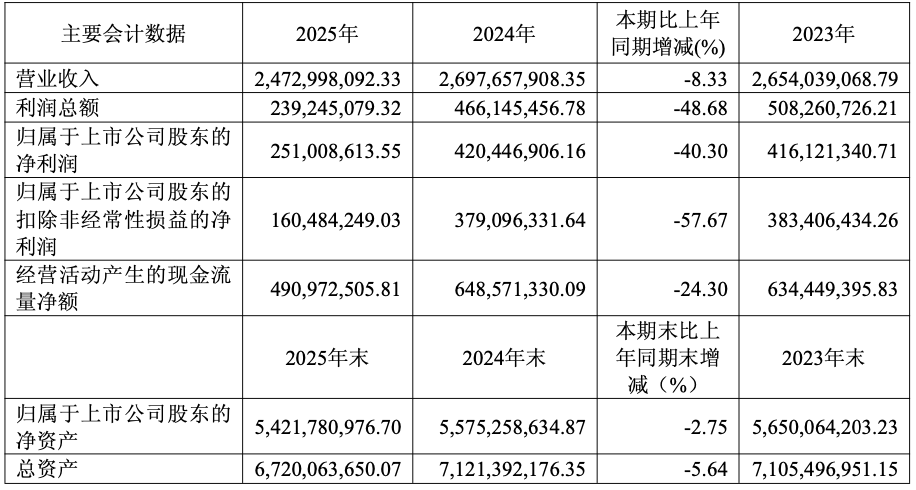 2025年,昊海生科首现近五年营收负增长,公司营业收入为24.7亿元,同比下降8.33%;归母净利润为2.51亿元,同比下降40.3%;扣非归母净利润为1.6亿元,同比下降57.67%。