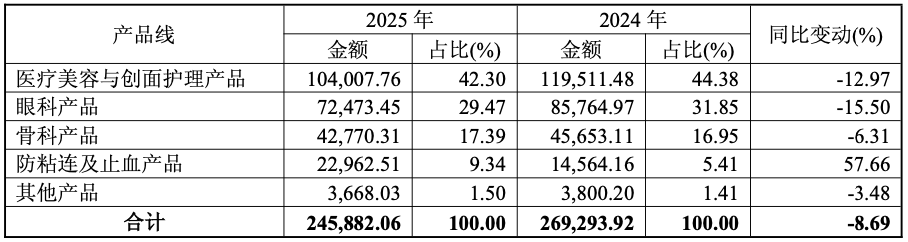 从收入结构来看,医疗美容与创面护理、眼科两大主力合计占比超七成,却分别下滑12.97%和15.50%,拖累整体营收;骨科亦下降6.31%。仅防粘连及止血产品逆势大增57.66%,但占比不足一成难补缺口,公司面临主力产品线集体失速的严峻挑战。