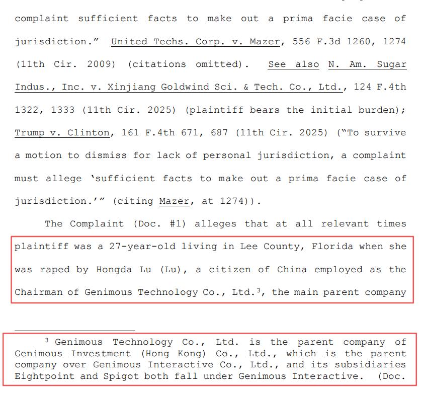 蓝鲸新闻通过相关渠道拿到上述裁定文件后发现,文件中披露了一名居住在佛罗里达的27岁女性,指控遭到名为Hongda Lu的中国公民强奸,并指出,Hongda Lu为Genimous Technology Co., Ltd.董事长。
