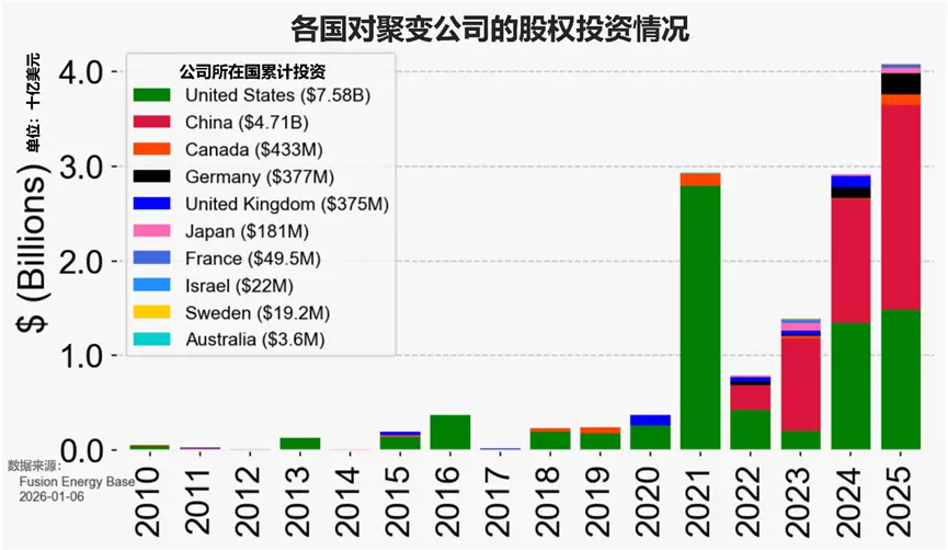 据国际原子能机构《2025年世界聚变展望》报告,全球有近40个国家正在推进聚变计划。据聚变咨询机构Fusion Energy Base统计,自2021年起,全球聚变公司的股权投资规模快速增长,尤其是2023年之后,中国的投入显著提升。2025年全球年度投资规模已接近40亿美元,中国和美国占其中绝大部分投资额。