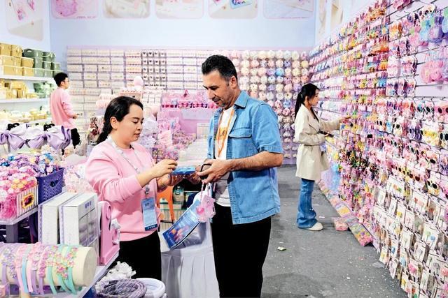 4月12日,在2026中国义乌国际日用百货创新博览会上,伊朗外商在洽谈DIY手工串珠采购业务。