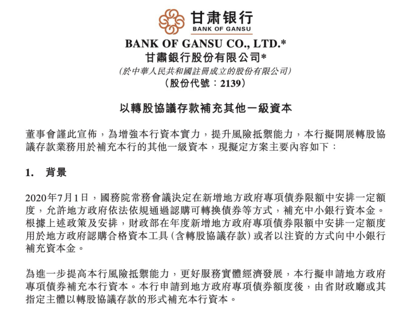 2025年8月,甘肃银行曾披露,为增强资本实力,提升风险抵御能力,该行拟与甘肃省财政厅或其指定主体签订转股协议,约定甘肃省财政厅或其指定主体以存款的形式将专项债资金存入该行,额度不超过30亿元人民币,补充该行的其他一级资本,该行每半年支付一次利息。