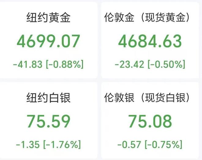贵金属集体下跌。现货黄金失守4690美元/盎司,日内跌0.5%,纽约期金失守4700美元/盎司,跌近0.9%。现货白银跌0.75%,纽约期银跌近1.8%。