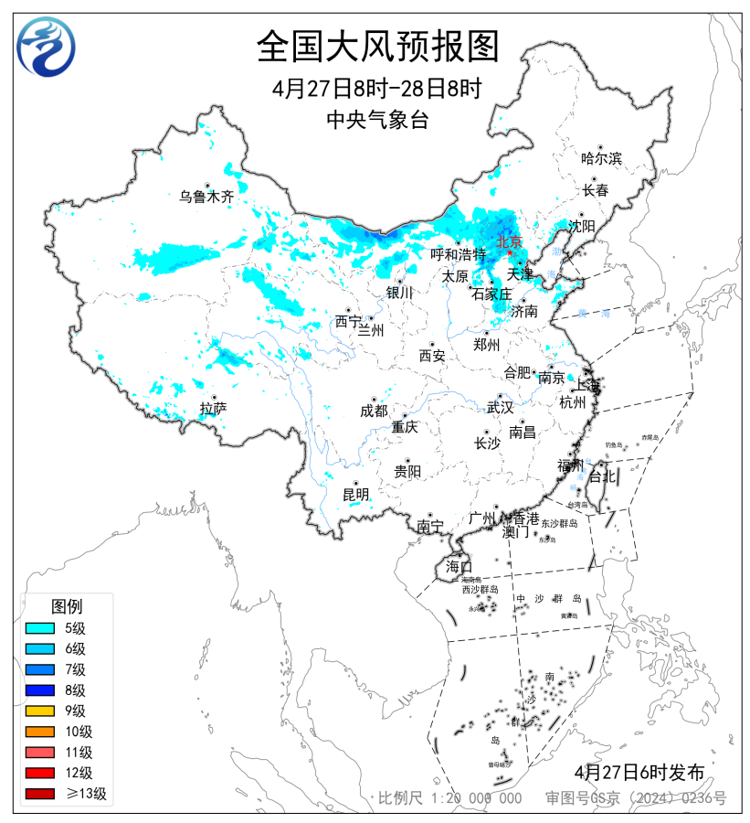 预计,4月27日08时至28日08时,内蒙古中西部、山西东北部、河北北部和西部、北京、天津、辽宁中西部、山东东部