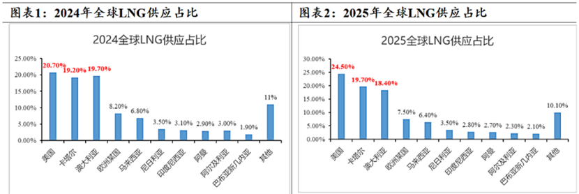 广州期货近日撰文称,2025年全球LNG产量约为4.90亿吨,同比+4.3%。全球LNG头部供应表现较为集中,主因美国在全球占比升高所致。在LNG主产国之中,占比第一的是美国为24.5%,其次是澳大利亚和卡塔尔,分别占比19.7%和18.4%,前三名的占比高达62.6%,相较去年同期升高3个百分点。