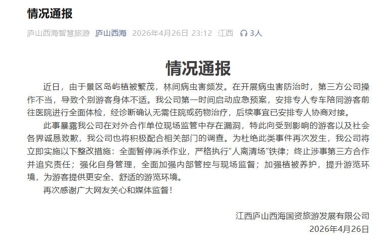 通报称,近日,由于景区岛屿植被繁茂,林间病虫害频发。在开展病虫害防治时,第三方公司操作不当,导致个别游客身体不适。公司第一时间启动应急预案,安排专人专车陪同游客前往医院进行全面体检,经诊断确认无需住院或药物治疗,后续事宜已安排专人协商对接。