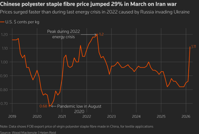 自伊朗战争以来,化石燃料价格的飙升正给印度和孟加拉国的聚酯供应商及服装制造商带来巨大压力,而这可能导致Zara和H&M等快时尚零售商的成本快速上升。