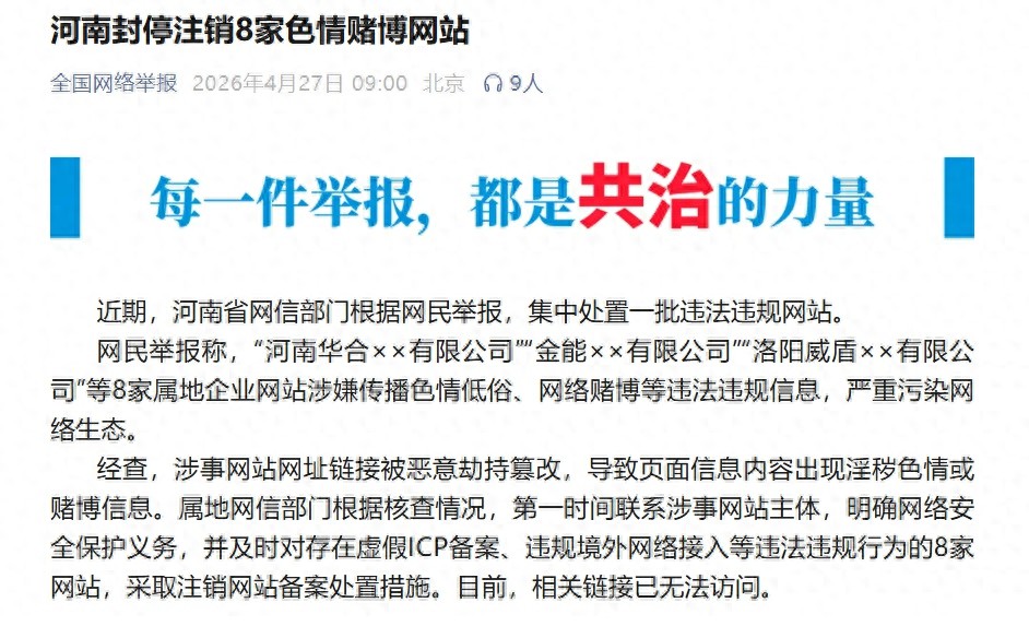 据全国网络举报,近期,河南省网信部门根据网民举报,集中处置一批违法违规网站。