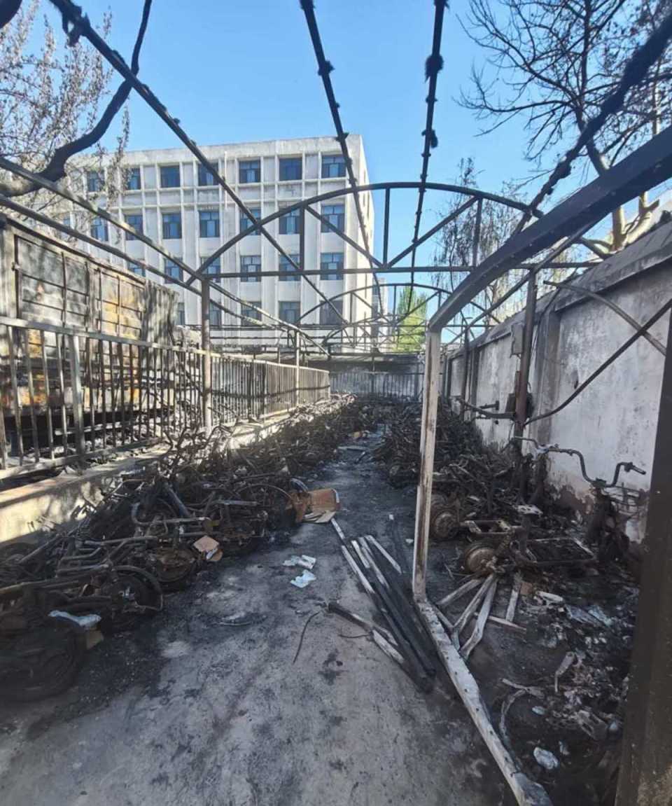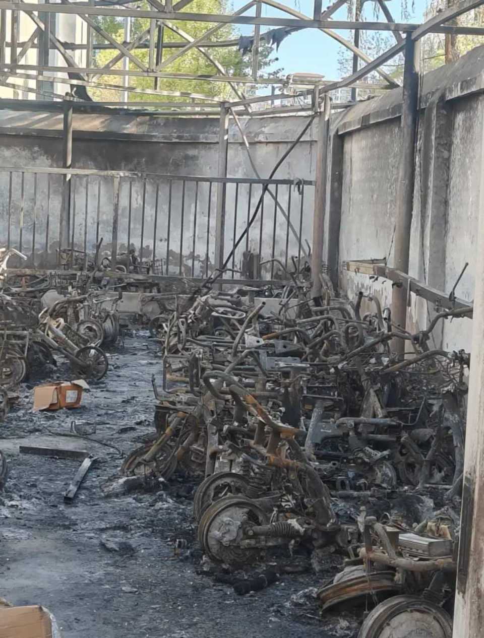 另有网友事后发布图片显示,车棚内的数十辆电动车和自行车都只剩下空架,旁边还有一辆货车车厢也被殃及。