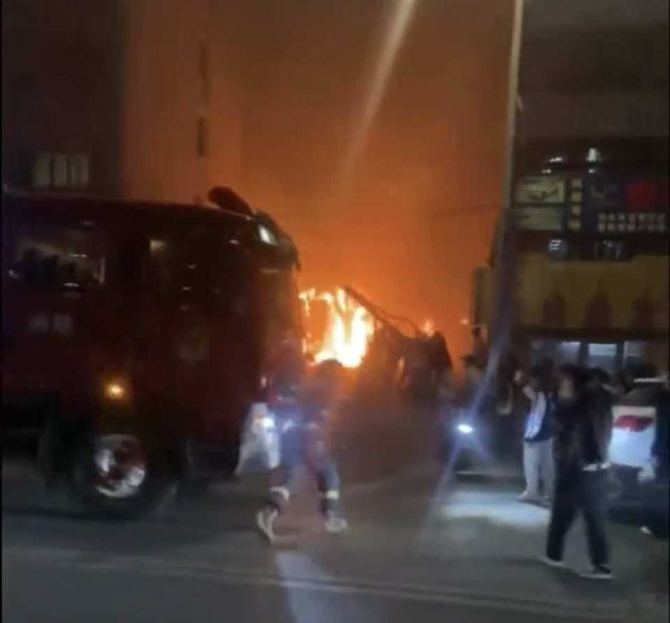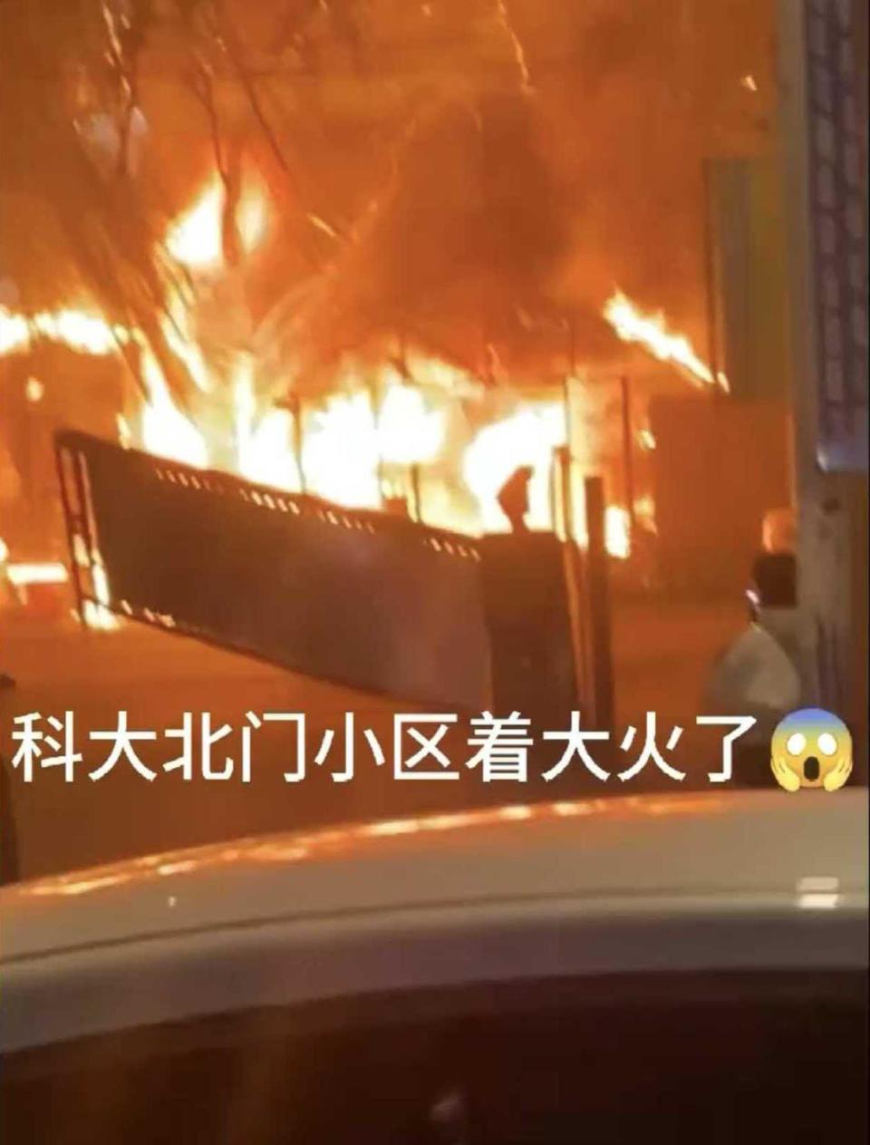 网友拍摄的多个现场视频显示,门口道闸内燃起熊熊大火,有人站在门口打电话,不一会儿消防车呼啸着赶来,消防员下车跑向火灾现场……