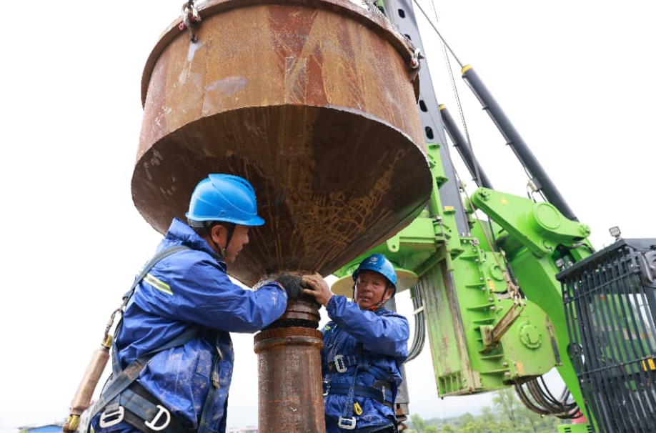 面对施工区域岩石硬度高、重冰区铁塔架设难度大、山区物资运输不便等挑战,国网湖南省电力有限公司坚持党建引领、党员攻坚,联合参建单位提前深入郴州、怀化、湘西沿线山区、林地等区域开展全线路实地踏勘,针对性制定专项施工方案:采用“旋挖钻机+水磨钻+爆破”组合工艺破解岩石开挖难题。投入电建旋挖钻机、履带式电建起重机、落地摇臂抱杆等适配重冰区铁塔架设需求的专用装备。创新应用重载无人机多机协同运输施工物资,无需开辟临时施工道路,数分钟即可完成原本数小时的山地运输任务,大幅提升施工效率的同时减少对山林生态的影响。