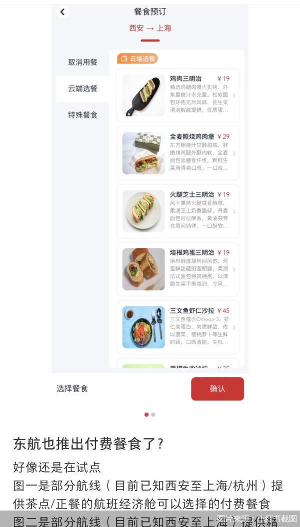 北京商报记者从东航了解到,东航4月在西安出港的11条航线上推出“万物滋养,美味健康”主题付费点餐服务,具体餐食包括香烤鸡胸肉沙拉、全麦牛肉堡、火腿芝士丹麦面包三明治等。根据旅客在社交媒体晒出的预订页面,这些餐食的标价分别为19元、29元、45元等。