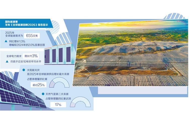 国际能源署(IEA)近日发布其年度旗舰报告《全球能源回顾2026》提出,2025年,在复杂的经济和地缘政治背景下,全球能源需求增长放缓,但电力使用量持续强劲增长,同时,全球能源需求增长呈多元化趋势,太阳能光伏首次成为全球能源供应增长的最大来源。