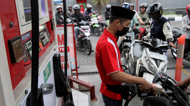 在印度尼西亚梭罗工作人员为摩托车加油 (新华社图)
