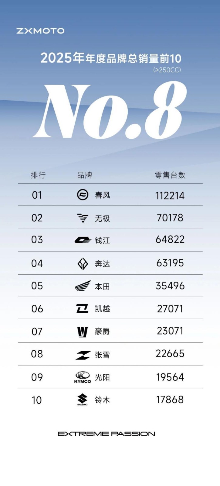 相关资料显示,2025年品牌销量排名前十(≥250CC)分别为:春风(11.22万辆)、无极( 7.02万辆)、钱江(6.48万辆)、奔达(6.32万辆)、本田(3.55万辆)、凯越(2.71万辆)、豪爵(2.31万辆)、张雪(2.27万辆)、光阳(1.96万辆)、铃木(1.79万辆)。