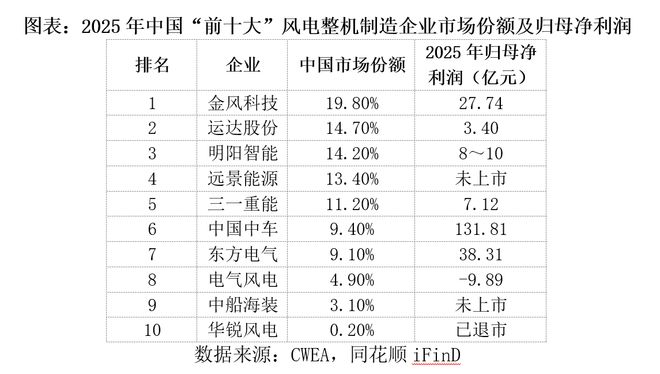 作为海上风电龙头企业,电气风电的亏损态势在行业头部企业中显得尤为突出。根据CWEA发布的2025年中国风电整机制造企业新增装机容量前十名榜单,电气风电排名第八,市场份额为4.9%,仍处于行业头部阵营。