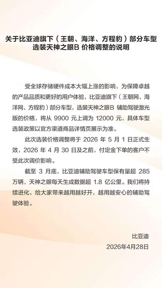 4月28日晚,比亚迪宣布,5月1日起,旗下王朝、海洋、方程豹品牌部分车型,选装“天神之眼B辅助驾驶激光版”的价格将从9900元调整为12000元,涨幅2100元。4月30日及之前支付定金的客户不受此次调价影响。比亚迪在公告中解释,此次调价主要原因是受全球存储硬件成本大幅上涨的影响。