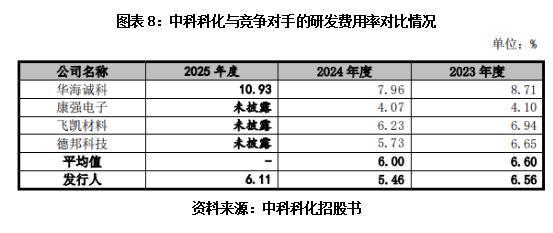 规模差距之外,研发投入的显著差异,进一步凸显中科科化的竞争劣势。在技术密集型的半导体材料赛道,研发投入直接决定高端产品突破与技术迭代的速度。招股书显示,2023—2025年,中科科化研发费用率分别为6.56%、5.46%、6.11%,整体呈现波动下行;而同期华海诚科研发费用率分别为8.71%、7.96%、10.93%,不仅持续攀升,且始终显著高于中科科化。